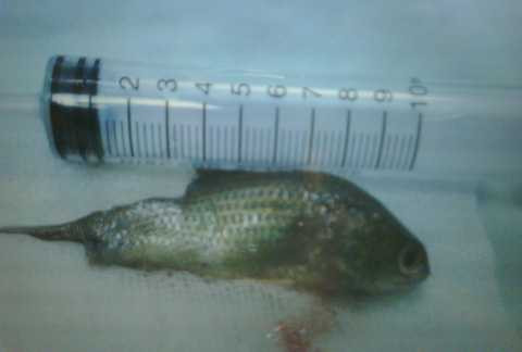 | Con cá rô được lấy ra từ họng bệnh nhân (Ảnh: NLĐ) |