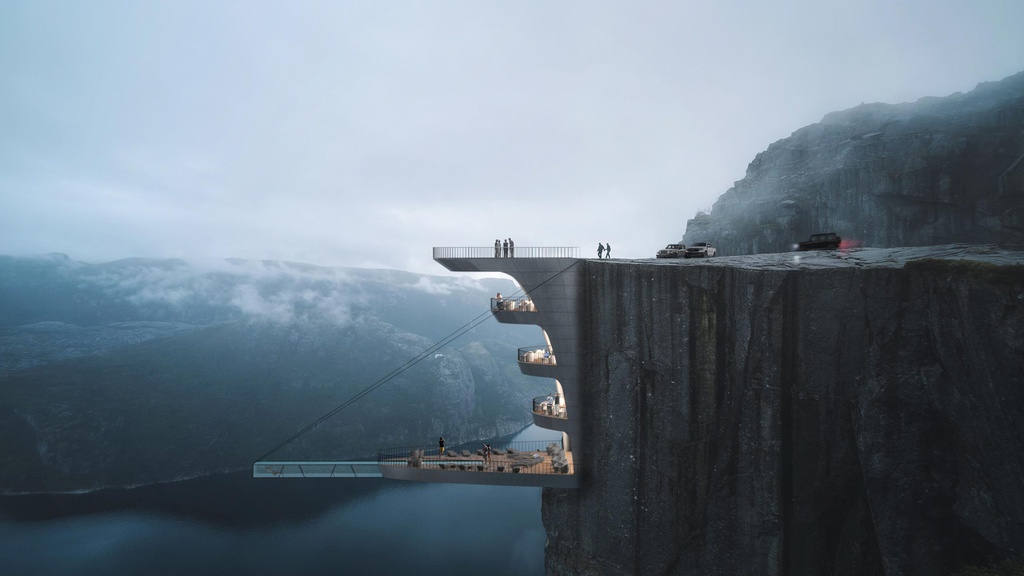 Một ý tưởng thiết kế kiến trúc ngoạn mục khác là công trình khách sạn bất chấp trọng lực nằm ở rìa vách đá Preikestolen cao 604 m ở Na Uy. Vách đá ở miền nam Na Uy này là một điểm thu hút khách du lịch nổi tiếng với tầm nhìn ra vịnh hẹp Lysefjorden.
