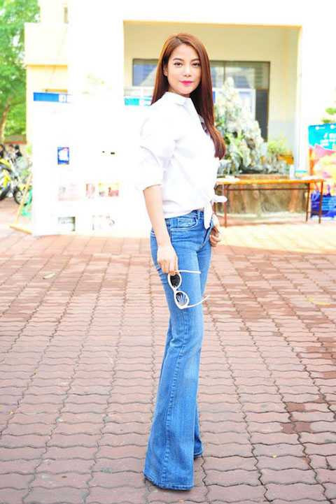 | Quần jeans ống loe tôn dáng vẻ thanh mảnh, đôi chân thon dài của Trương Ngọc Ánh. |