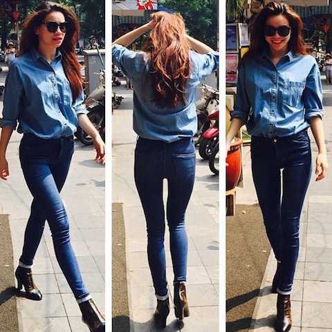 | Hồ Ngọc Hà khoe dáng khoẻ khoắn với phong cách denim-on-denim. |