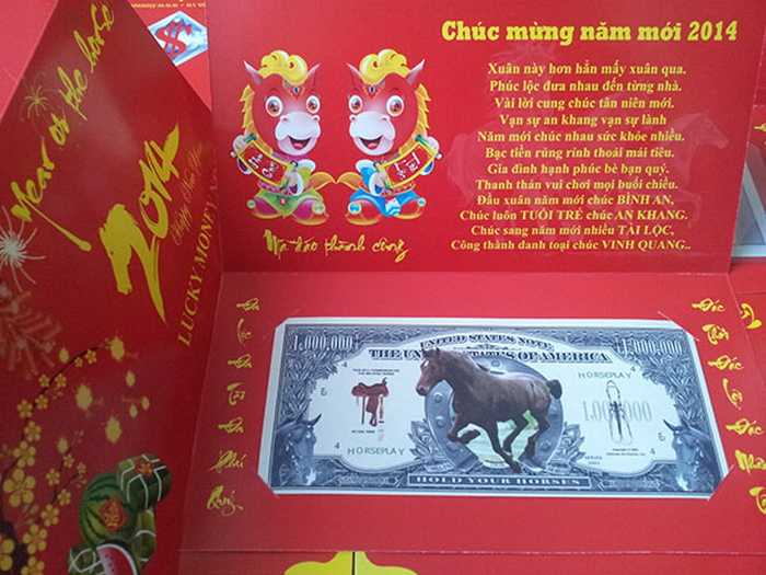 Tờ 1 triệu USD in hình Ngựa 2014 (Giá bán: 60.000 đồng): Tờ tiền này ở dạng tiền kỉ niệm, không có giá trị lưu thông.