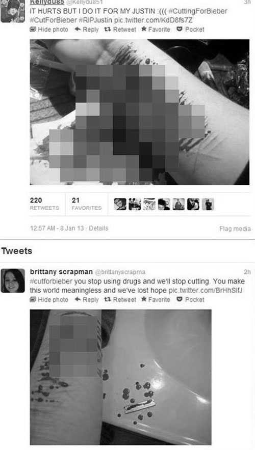 Một số teen còn bày tỏ mong muốn Justin hãy cai nghiện cần sa, nếu Justin vẫn còn nghiện hút thì những bạn trẻ này sẽ không ngừng rạch tay của mình. Đây được xem là thái độ biểu tình thái quá của một bộ phận teen Mỹ yêu thích Justin Bieber.