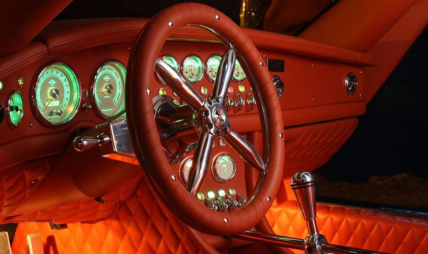 Nhưng khi nhìn vào bảng điều khiển và vô lăng, bạn sẽ thấy bất ngờ. Nó đi kèm với các đồng hồ đo kiểu dáng cổ điển sáng lên với ánh sáng xanh kỳ lạ. Mặt khác, vô lăng giống với những chiếc tàu cướp biển và vành vô lăng dày đến mức vô lý.