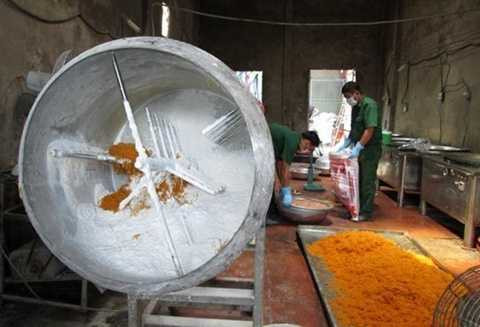 | Trong khi nạn "thịt heo sữa thối" giảm hẳn thì năm 2014, những vụ làm giả thực phẩm lớn lại rầm rộ. Đặc biệt, ngày 8/5/2014, Đội CSĐT tội phạm về môi trường CATP Quảng Ngãi đã bắt quả tang công ty Thuận Thành An có hành vi sản xuất, chế biến từ sản phẩm thịt heo thành thịt bò khô. Cảnh sát môi trường đã tịch thu 14 thùng các tông đựng 257 kg thịt heo thành phẩm được bỏ trong bao bì thịt bò khô, cùng hàng chục ký bao bì nhãn thịt bò khô Thuận Đạt, chất phụ gia, thịt heo thành phẩm chưa đóng gói. Mỗi ngày công ty đã bán ra thị trường hàng trăm ký khô bò giả. (Ảnh: CAĐN) |