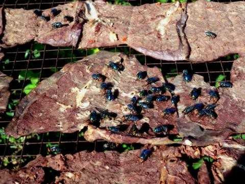 | Tại đây, khi đoàn kiểm tra ập vào, phổi heo luộc, phổi heo còn sống để đầy nền sàn, đầy ruồi nhặng bu bám. Phổi heo sơ chế được thái nhỏ làm giả khô bò để trực tiếp trên nền sàn, ruồi bu bám và chó, gà chạy qua lại. Ông Sơn Chiều, chủ cơ sở này cho biết phổi heo thu mua về chế biến thành khô bò đen, bỏ mối cho bạn hàng ở quận 5, quận 6, dùng để bán bánh tráng trộn cho học sinh ăn. (Ảnh: Hoàng Việt) |