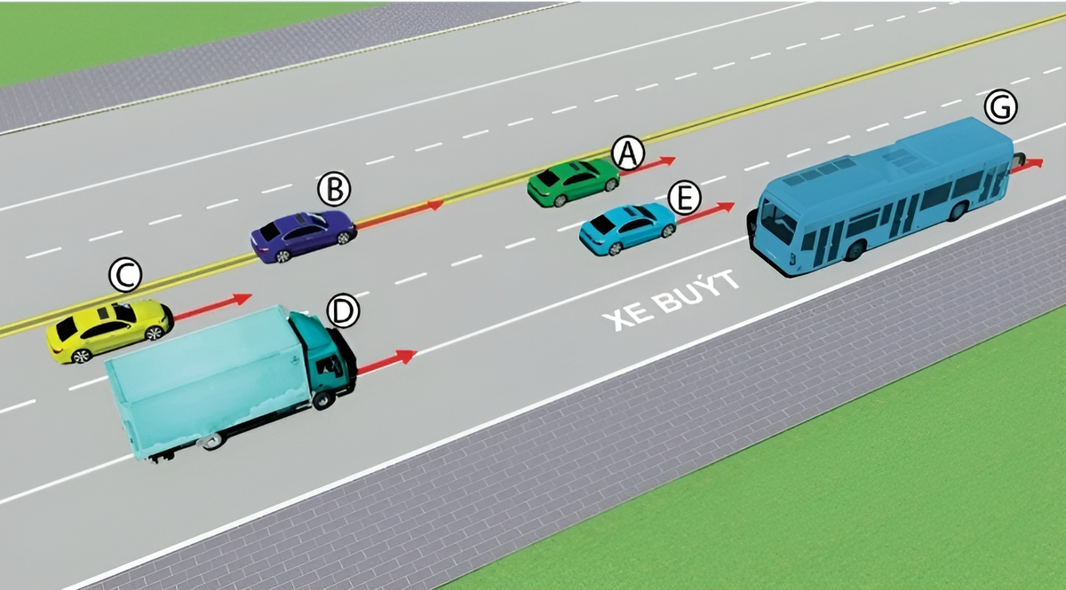 Trong trường hợp này, xe con (B) và xe tải (D) đang đè vạch nên vi phạm quy tắc giao thông. - D