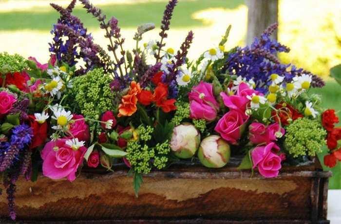 Kết hợp hoa oải hương chớm nở, hoa mẫu đơn và hoa hồng với hoa dại trong một hộp gỗ thấp mộc mạc để làm tươi sáng thêm bệ cửa sổ.