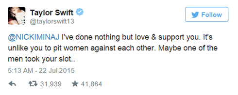 Ngay sau đó, Taylor đáp trả Nicki với lời nhắn: "Nicki, tôi luôn dành tình cảm cùng sự ủng hộ dành cho bạn. Việc này không giống bạn chút nào khi tạo ra mâu thuẫn giữa những cô gái.