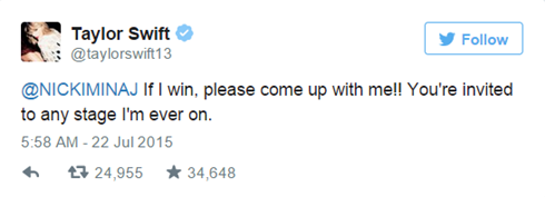 "Nicki, nếu tôi thắng, hãy đến cùng tôi!! Bạn được mời đến bất kỳ sân khấu nào mà tôi có mặt". Không lâu sau, Taylor đã xóa sạch những Tweet liên quan đến vụ lùm xùm này.