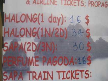 Cụ thể, một số tour ngắn ngày như Hạ Long (1 ngày) 16 USD, Hạ Long (1 ngày, 2 đêm) có giá 34 USD, còn Sapa (2 đếm/3 ngày) 30 USD… Đó chưa phải là tất cả, theo bảng báo giá mức giá của tour Hạ Long thay đổi tùy theo lựa chọn của khách ngủ đêm trên tàu hay khách sạn, cao nhất là 195 USD (2 ngày/ 3 đêm). Nhân viên này cho hay: “Tỷ giá quy đổi là 21.000 đồng/USD, khách Việt có thể trả bằng tiền đồng. Khách trả tiền vào thời điểm đăng ký tour’’.