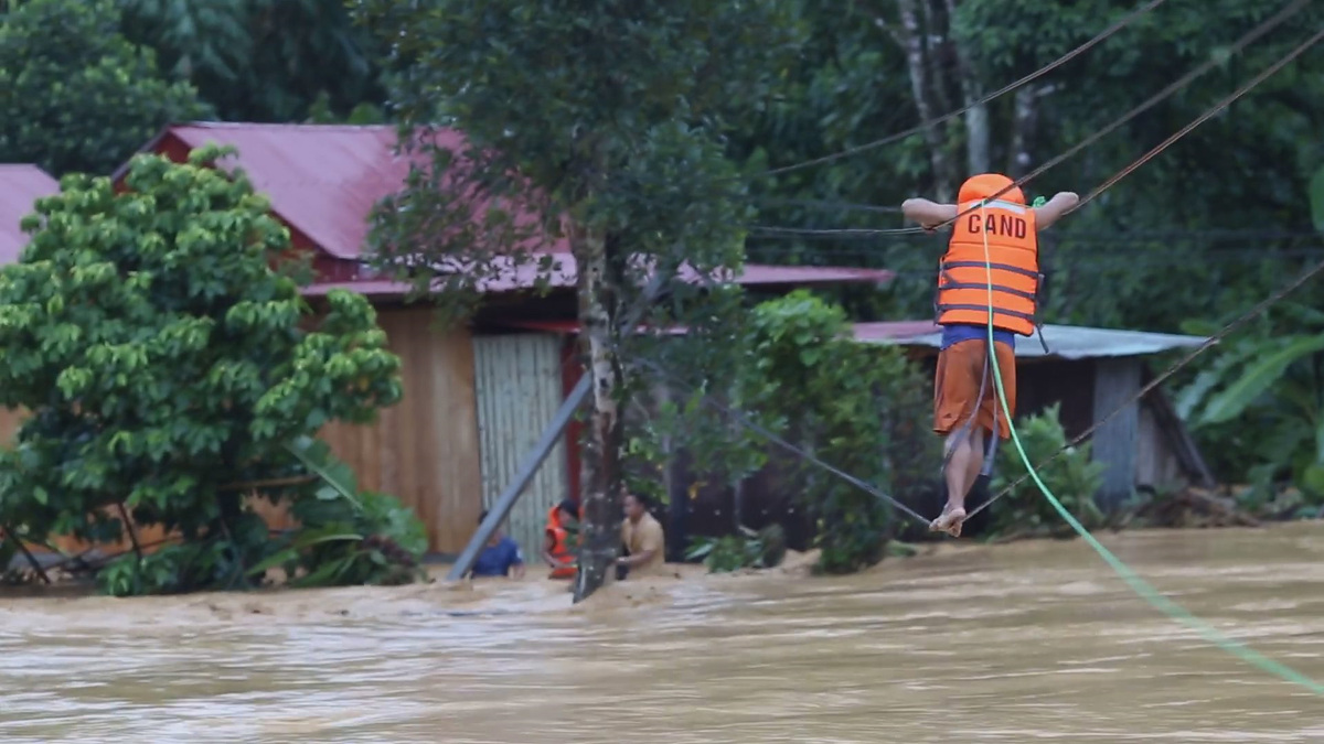 Do ảnh hưởng của bão số 5, công an huyện Tây Giang, Quảng Nam phải đu dây giữa dòng nước xiết để giải cứu người dân trong nước lũ.