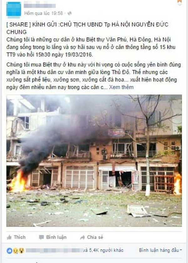 Liên quan đến vụ nổ kinh hoàng khiến nhiều người thiệt mạng ở khu đô thị Văn Phú (Hà Đông, Hà Nội) mới đây, trên một số trang mạng xã hội xuất hiện đơn cầu cứu của người dân sống ở khu đô thị Văn Phú gửi đến Chủ tịch UBND TP Hà Nội Nguyễn Đức Chung.