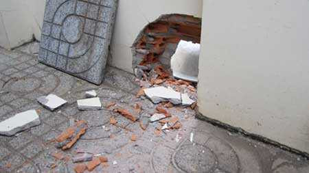 | Một góc tường bị thủng vì vụ nổ (Ảnh Thanh Niên) |