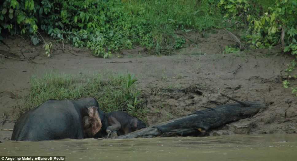 Voi mẹ dùng vòi của mình cố đẩy voi con lên bờ