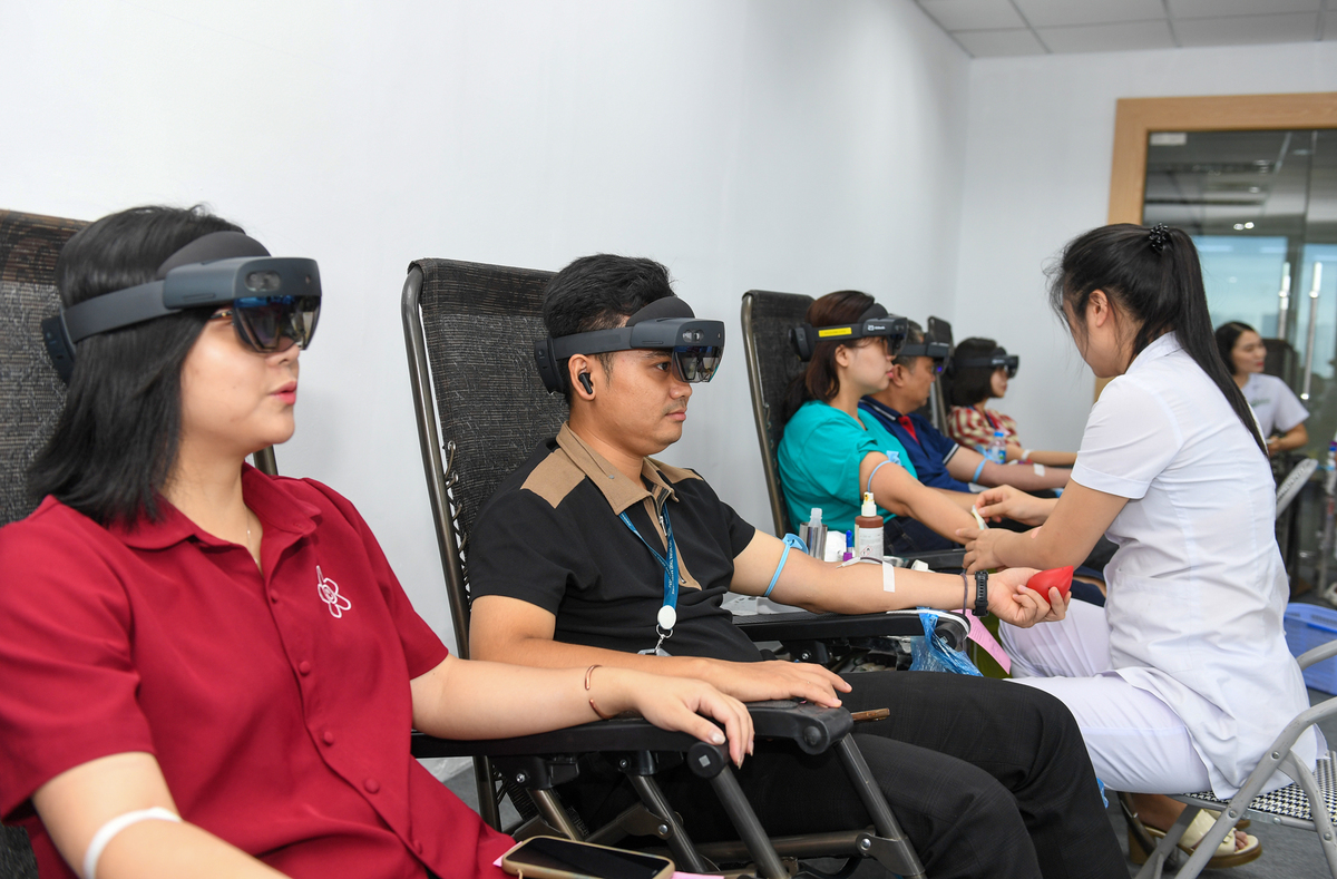 Người tham gia hiến máu trải nghiệm công nghệ thực tế ảo tích hợp.