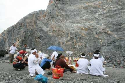 | Gia đình nạn nhân Hoàng Văn Bình đang làm lễ “gọi hồn” tại mỏ đá |