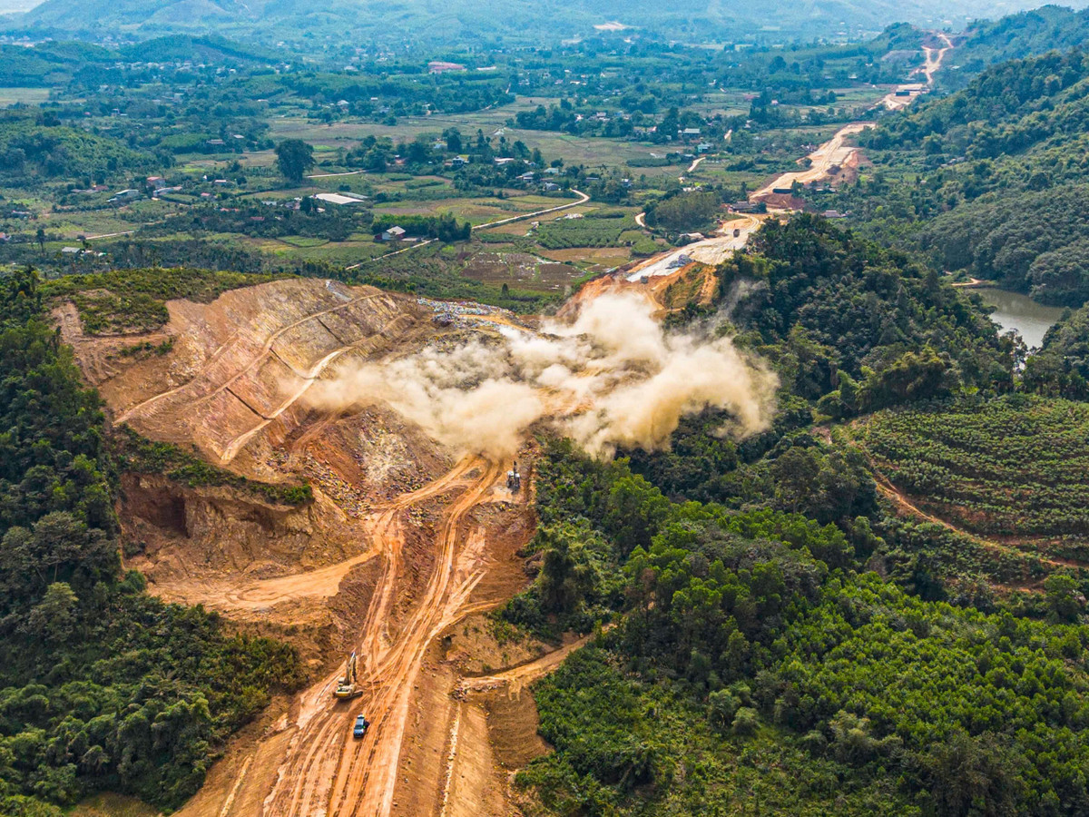 Trưa 23/11, đơn vị thi công cho nổ mìn phá núi để thi công cao tốc, đoạn qua tỉnh Tuyên Quang.