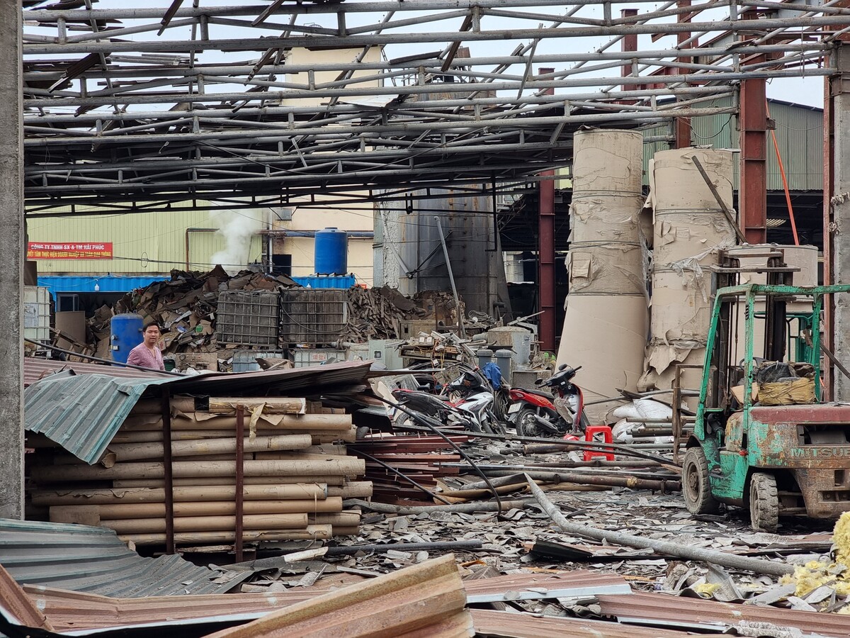Trên sàn vương vãi nhiều đoạn sắt thép, tấm tôn và loạt thiết bị biến dạng ngổn ngang.