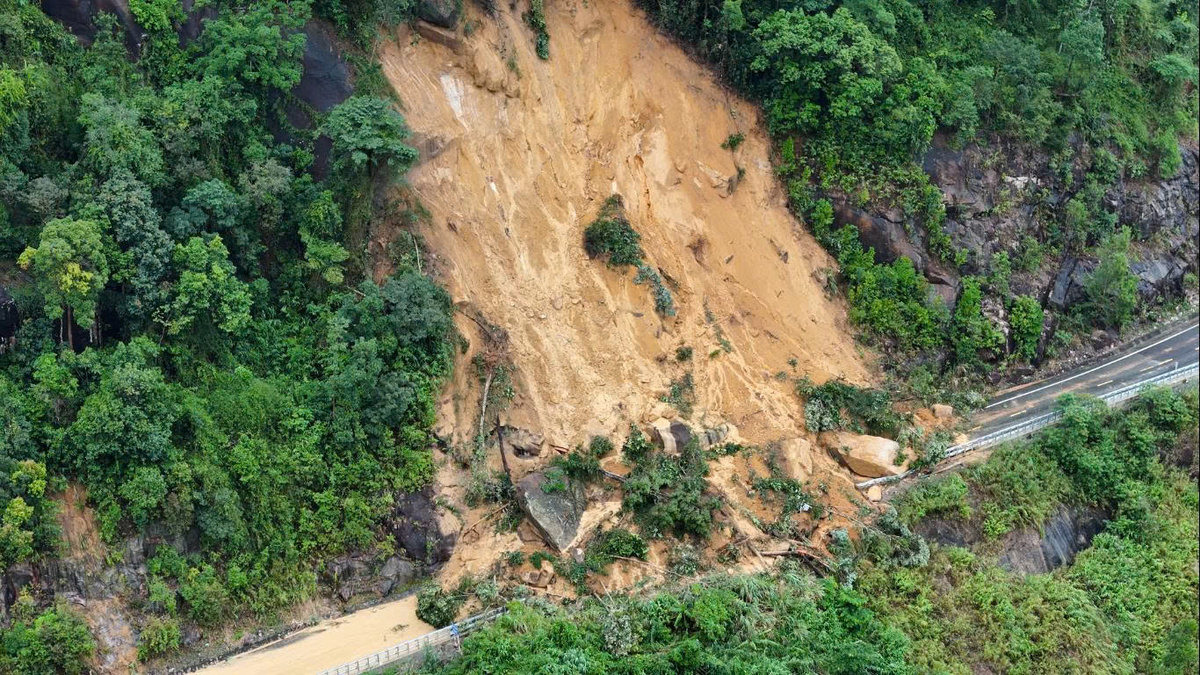 Một lượng lớn đất đá khoảng 500m3 đổ ập xuống đường khiến giao thông chia cắt trên đèo Khánh Lê.