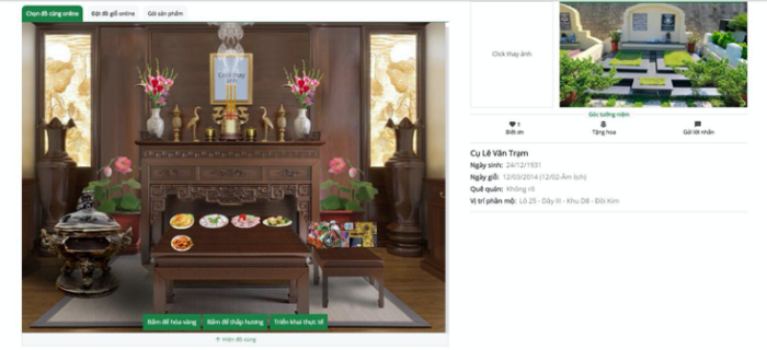 Theo đó, khách hàng có người thân đang an nghỉ tại nghĩa trang này vẫn thực hiện đầy đủ các hoạt động thăm viếng, thắp hương, cúng giỗ nhân dịp Tết thanh minh nhưng bằng hoạt động online. Bất cứ ai cũng có thể vào website của chủ đầu tư nghĩa trang này, chỉ cần nhớ tên người mình muốn thắp hương, vào thanh tìm kiếm sẽ hiện ra toàn bộ thông tin và hình ảnh phần mộ của người đã khuất.
