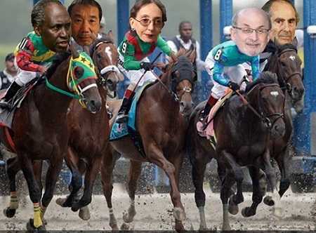 | Từ trái sang: Nhà thơ Kenya Ngugi Wa Thiong’o, nhà văn Nhật Bản Haruki Murakami, nhà văn Mỹ Joyce Carol Oates, nhà văn Anh gốc Ấn Độ Salman Rushdie và nhà văn Mỹ Philip Roth |