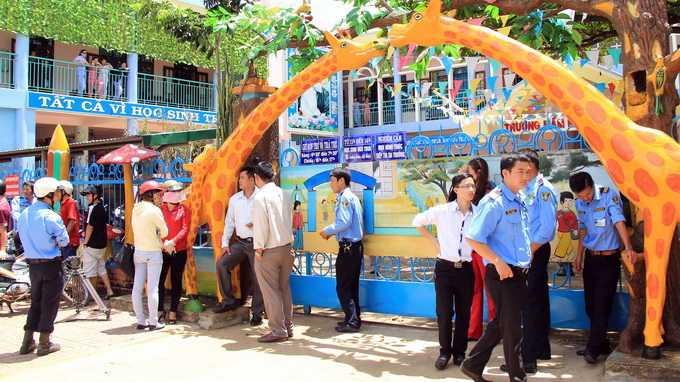 Vệ sĩ đứng trước cổng trường mầm non