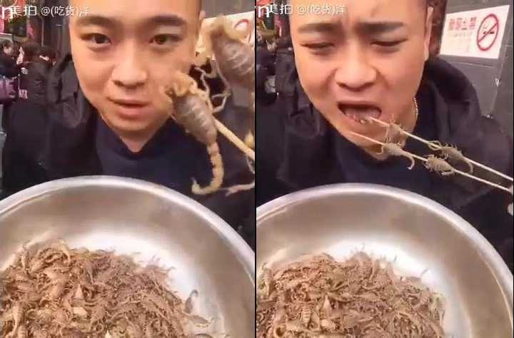 Cảnh chàng trai ngấu nghiến ăn những con bọ cạp còn sống ngoe nguẩy khiến người xem nổi da gà.