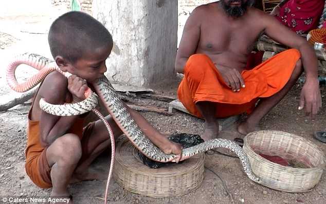 Ở ngôi làng Gauriganj ở Ấn Độ, trẻ em được dạy trở thành người dụ rắn từ năm lên 2 tuổi, bởi vậy, những con rắn hổ mang không còn xa lạ và đáng sợ với các em nữa.