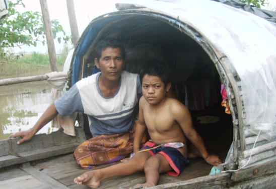 Cháu SaNaVi cùng cha trên chiếc xuồng cũ kỹ dưới bến sông và cũng là nơi đang có bốn nhân khẩu cùng chung sống.