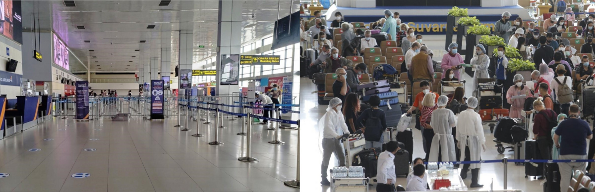 Hình ảnh trái ngược về bay quốc tế ở sân bay Thái Lan (trên) và Việt Nam (dưới).