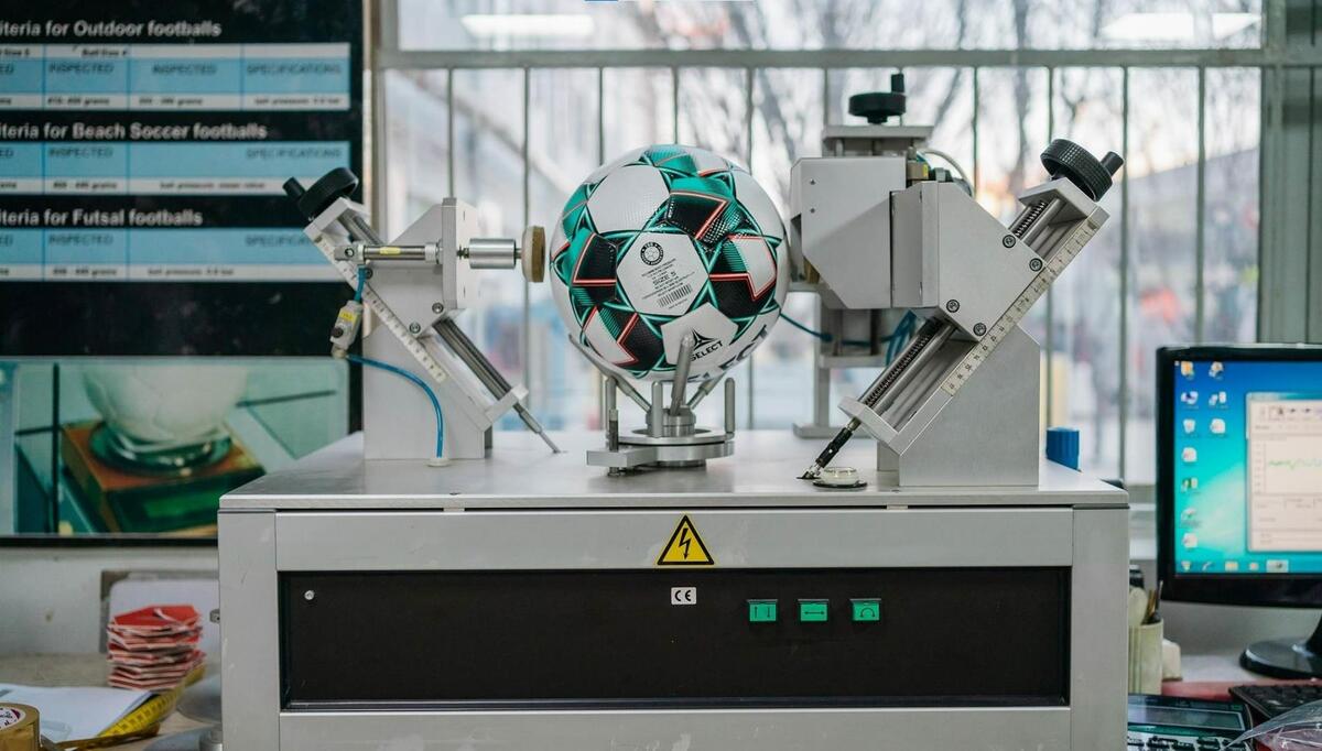 Những quả bóng đã hoàn thành sẽ trải qua quá trình kiểm tra nghiêm ngặt để đáp ứng tiêu chuẩn của FIFA. Người dân trên thế giới mua khoảng 40 triệu quả bóng mỗi năm, và con số này sẽ tăng hơn khi World Cup diễn ra. Trong ảnh, quả bóng đang được kiểm tra độ tròn để đảm bảo khả năng chuyển động và độ nảy.