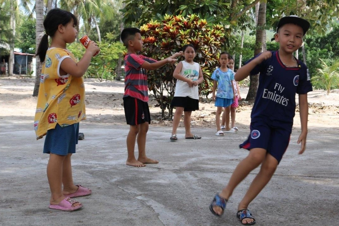 Đi khắp làng phong, chúng tôi bắt gặp rất nhiều trẻ đang hồn nhiên vui đùa, chạy nhảy trên con đường làng rợp mát bóng dừa.