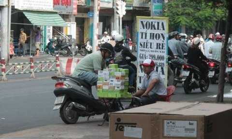 Mới hơn 8 giờ sáng, ở phía đối diện với cây xăng Comeco (Lý Thường Kiệt, P.8, Tân Bình, TP.HCM), người đàn ông ngoài 30 tuổi đã dọn hàng ra bán. Một đống khoảng 8 lớp hộp điện thoại được bày trên bàn. Trên hai cột điện, người đàn ông treo các tấm băng rôn khá thu hút: “Nokia tí hon siêu rẻ, nhìn là muốn xài, giá 299.000đ”.