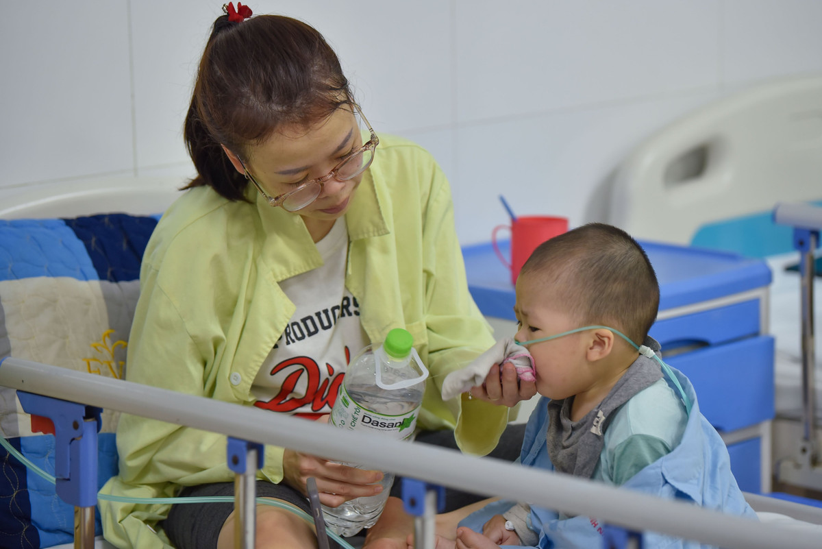 Trẻ điều trị bệnh lý hô hấp tại bệnh viện Thanh Nhàn. (Ảnh: Thế Đại)