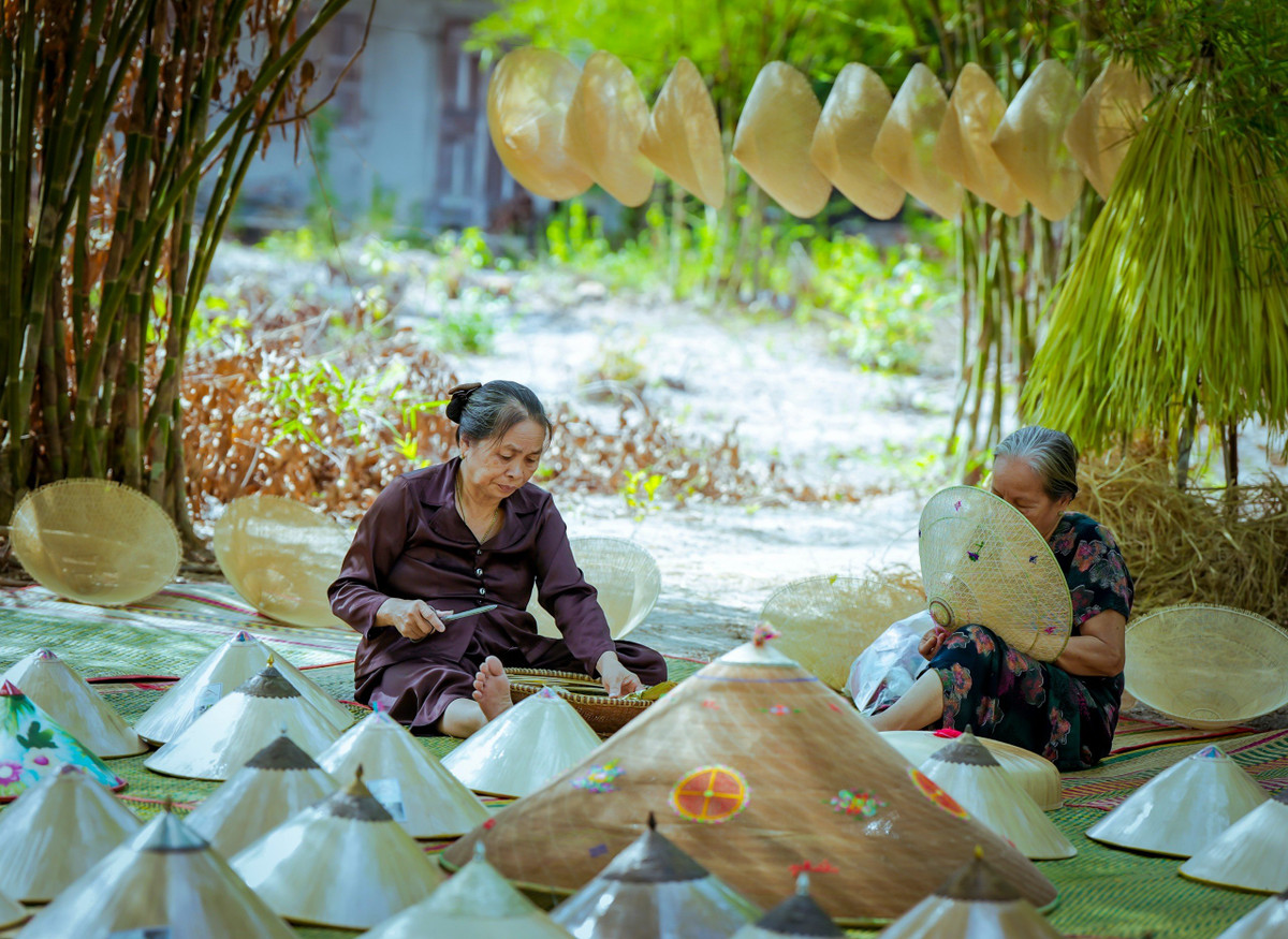 Những người phụ nữ cùng đôi bàn tay thoăn thoắt trò chuyện rôm rả dưới bóng vườn tre, chỉ một góc nhỏ cũng đủ rộn lên sinh khí của một làng nghề nón lá đặc trưng.