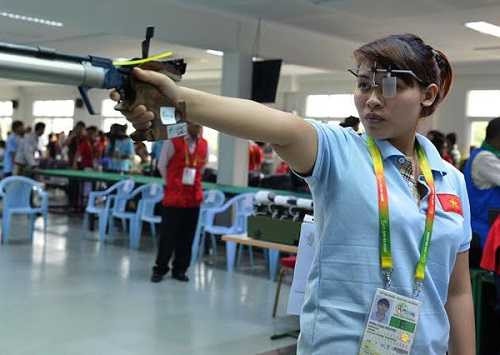 Ở nội dung 10 mét súng ngắn hơi nữ diễn ra sáng nay, ba xạ thủ Việt Nam gồm Lê Thị Hoàng Ngọc Nguyễn Minh Châu và Triệu Thị Hoa Hồng tranh tài cùng 15 VĐV khác của chủ nhà Myanmar, Thái Lan, Malaysia, Singapore, Lào.