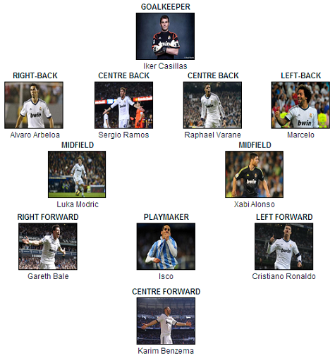 Ở hàng tiền vệ, vị trí của Mesut Ozil nhiều khả năng sẽ rơi vào tay của Isco, cầu thủ không có xu hướng dạt cánh quá nhiều. Bên cạnh đó, chủ tịch Florentino Perez tuyên bố sẽ làm mọi cách để mang Gareth Bale về Bernabeu hợp với Cristaino Ronaldo tạo ra đôi cánh “khủng” nhất thế giới. Ở những vị trí còn lại không có nhiều xáo trộn lớn, đáng chú ý chỉ có việc Casillas sẽ được trao lại quyền bắt chính cùng chiếc băng đội trưởng.
