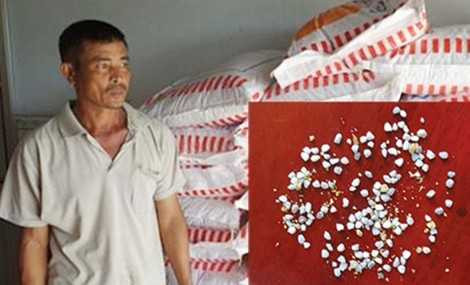 | Ông An với những bao cám chứa nhiều đá sỏi. |