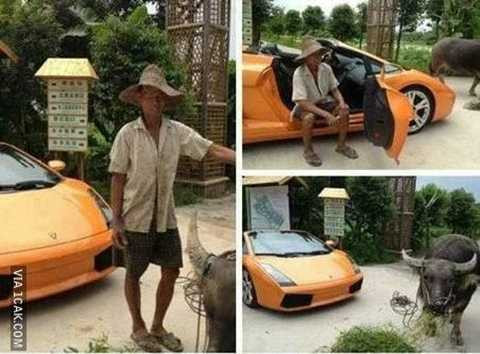 Những bức ảnh cho thấy, một người nông dân trong trang phục lôi thôi đang đứng bên cạnh con trâu và chiếc siêu xe Lamborghini tiền tỷ.