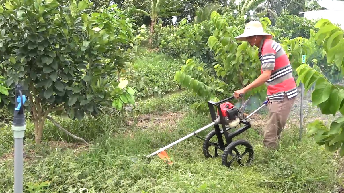 Xe cắt cỏ được gắn bánh xe và động cơ của ông Phạm Văn Đậm (Châu Phú, An Giang) có thể cắt được 1.000 m2 trong mỗi giờ, nhanh gấp 4 lần so với máy cắt thông thường.