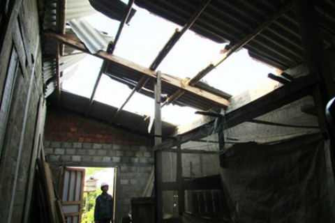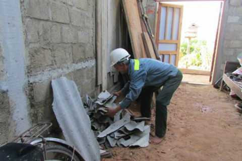 | Ngôi nhà tình nghĩa của bà Trần Thị Bòn (90 tuổi, trú thôn Tiên An, xã Vĩnh Sơn, Vĩnh Linh, vợ liệt sĩ) đã bị tốc mái hoàn toàn. Bà Bòn cũng bị thương do lốc xoáy khiến khúc gỗ rơi từ trên mái nhà đập vào tay bà. Con trai bà là Nguyễn Văn Quyên đang cố gắng dọn dẹp lại ngôi nhà cho mẹ. |