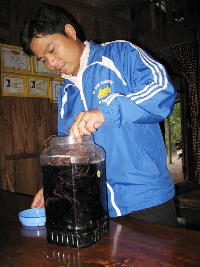 Nói xong, ông Pố xách ra can rượu 5 lít ngâm ba kích màu tím ngắt. Tôi đùa ông Pố: “Bố định giết chúng con ạ? Bố mang ra nhiều vậy uống cả tuần cũng không hết đâu”.