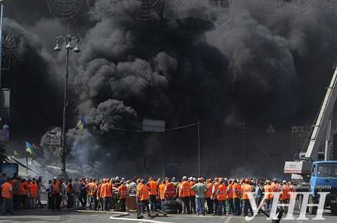 Họ đã đốt săm lốp và tạo ra các đám cháy lớn trên quảng trường. Theo ghi nhận của hãng tin RBK, các đám cháy xuất hiện tại các chiến lũy đối diện Nhà Công đoàn và phía Quảng trường châu Âu. Các nhân viên cứu hỏa đã đến hiện trường nhưng những người biểu tình đã ngăn cản không cho họ dập tắt các đám cháy.