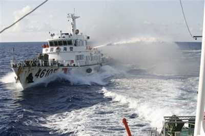 | Tàu Trung Quốc ngang ngược dùng vòi rồng tấn công tàu cảnh sát biển Việt Nam - Ảnh: Vietnam+ |