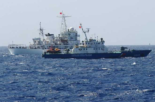 | Tàu bảo vệ bờ biển của Việt Nam giám sát tàu Trung Quốc tiến gần khu vực hạ đặt trái phép giàn khoan Hải Dương 981 trên biển Đông (Ảnh minh họa) |