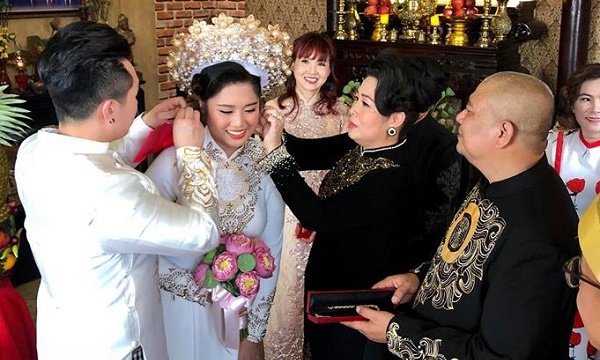 Lễ cưới tại nhà của con gái NSND Hồng Vân diễn ra trang trọng, đủ các nghi thức theo đúng lễ cưới truyền thống với sự chứng kiến của gia đình 2 bên.