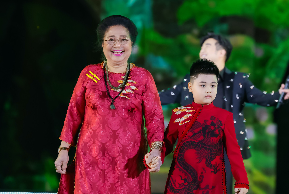Trong đêm diễn, khán giả bất ngờ, thích thú khi NSƯT Kim Tiến xuất hiện trên sàn diễn thời trang. Nữ nghệ sĩ dắt tay mẫu nhí 7 tuổi Hoàng Long.