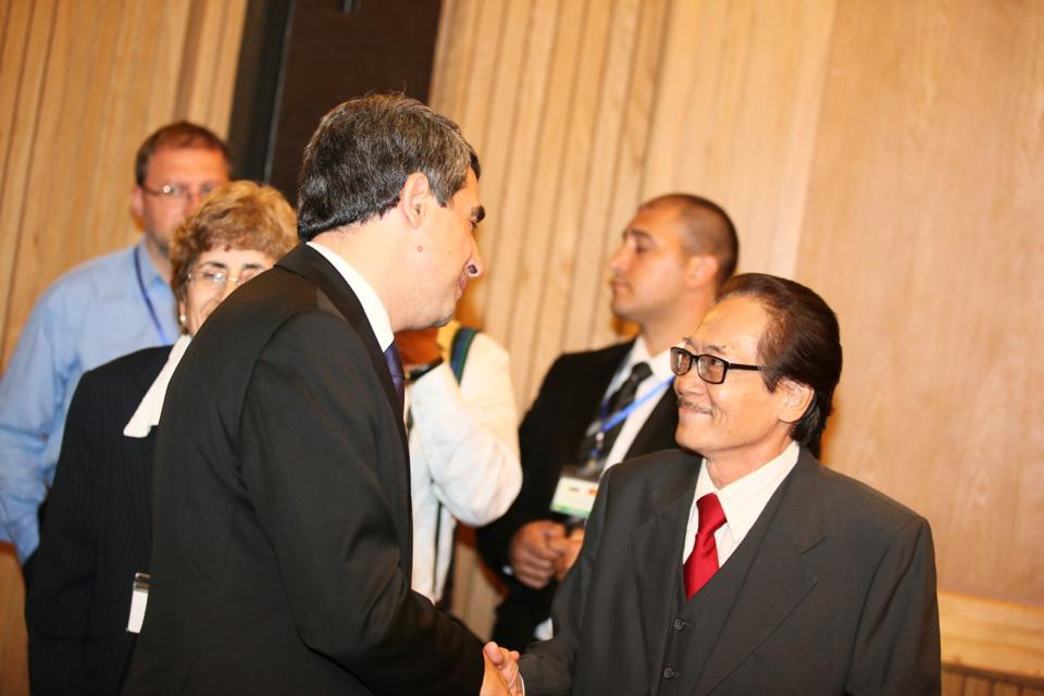 NSƯT Quốc Trụ (bên phải) trong buổi đón tiếp cựu Tổng thống Bulgaria Rosen Plevneliev tại Nhạc viện TP.HCM.