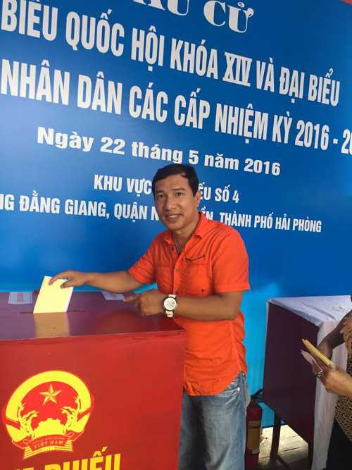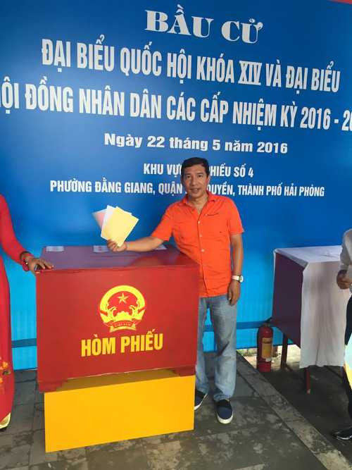 Cũng giống như nghệ sỹ Vân Dung, NSƯT Quang Thắng gác hết công việc chạy show thường ngày để đến khu vực bỏ phiếu số 4, phường Bạch Đằng, quận Ngô Quyền, TP Hải Phòng để tiến hành bỏ phiếu bầu cử đại biểu Quốc hội khóa XIV và đại biểu HĐND các cấp nhiệm kỳ 2016-2021.