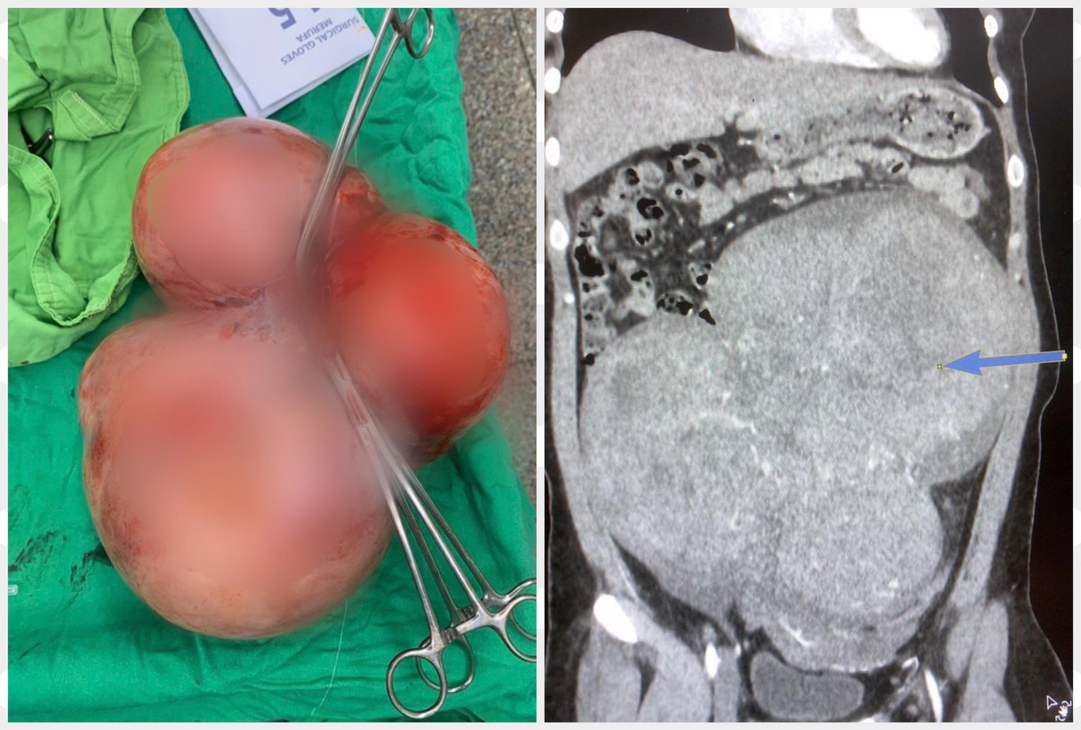 Kết quả siêu âm, chụp cắt lớp vi tính có tiêm thuốc cản quang ghi nhận u to vùng ổ bụng. Sau khoảng 1 giờ phẫu thuật, các bác sỹ cắt bỏ thành công khối u nặng 5,5kg, bảo tồn tử cung và 2 buồng trứng.